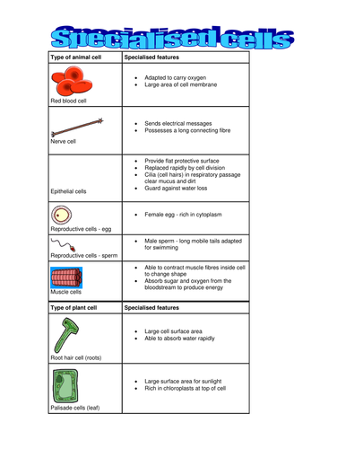 Cells, tissues, organs and organ systems split up the work in a way that exhibits division of labour and contribute to the survival of the body as a whole. Cell differentiation is when an unspecialised cell becomes specialised. Adrenal, liver and muscle cells are all examples of specialized cells with a predominantly tubular network and reflects the function of these cells. Chloroplasts are found in plant cells and other organisms that conduct photosynthesis (such as algae). Here are just a few of the specialised organelles that we know about: Before you were born, you started as just a bunch of cells! These ensure that the organism functions as a whole. They are the site where. Feb 29, 2012 · specialised organelles. Some cell types have their own specialised organelles that carry out functions that aren't required by all cells. A specialised cell is when a cell has certain features that make it very good at its job. There are many different types of cells in animals. These cells were stem cells.